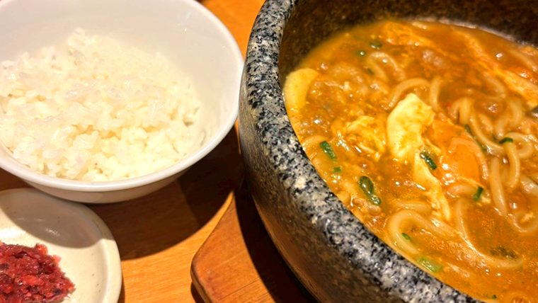 うどんを食べ終えたら、一口分のライスを入れて混ぜる「〆(シメ)」がおすすめ。
